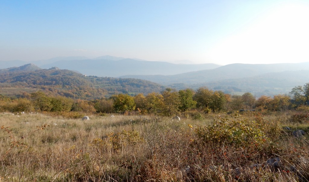 From the top, follow a wide rocky track down with a fence on your right. You’ll reach some trees on your left and it then levels out a little. There’s low scrub on your right. You can carry on all along this ridge but don’t, follow the path bending sharply round to the left. It is wide and obvious. This goes down hill through pine forest all the way back to Via Lupara (the road into Casertavecchia). In one place there was string across the track to keep the cows in and a couple of shepherd dogs which were quiet (but be cautious if you have dogs).