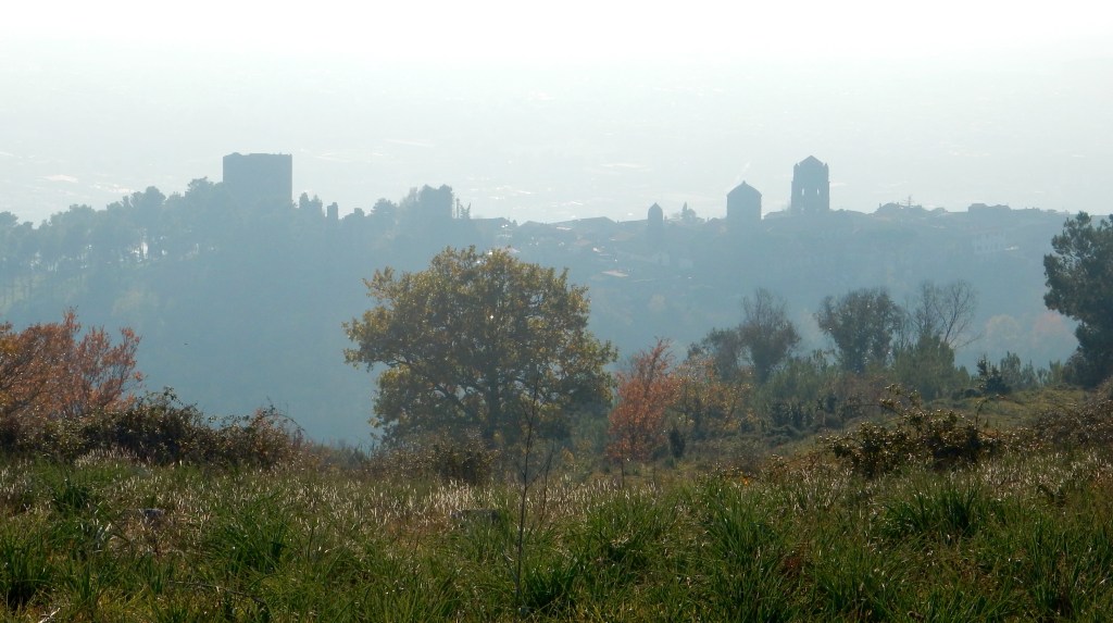 Keep the wall on your right and follow the well-worn track around the back of the hill. Here it rises very steeply to the top. Behind you are the hills near Caserta and in the Valle di Maddeloni and in the far distance the giant hulk of the Taburno range. To your right you’ll see the Matese Mountains (dusted in snow) and straight ahead the hills around Monte Maggiore. Your eye will be drawn to the castle on top of the hill at Castel Marrone just behind Monte Virgo. At the top you will reach an ugly solar/radio mast but the views are so wonderful you can ignore it! By now you can also look down on the remarkable towers of Casertavechia. We walked in the afternoon and they started to silhouette – it must be an amazing place to watch the sun go down. However, there is still a good 20-30mins back to the village so time it right!